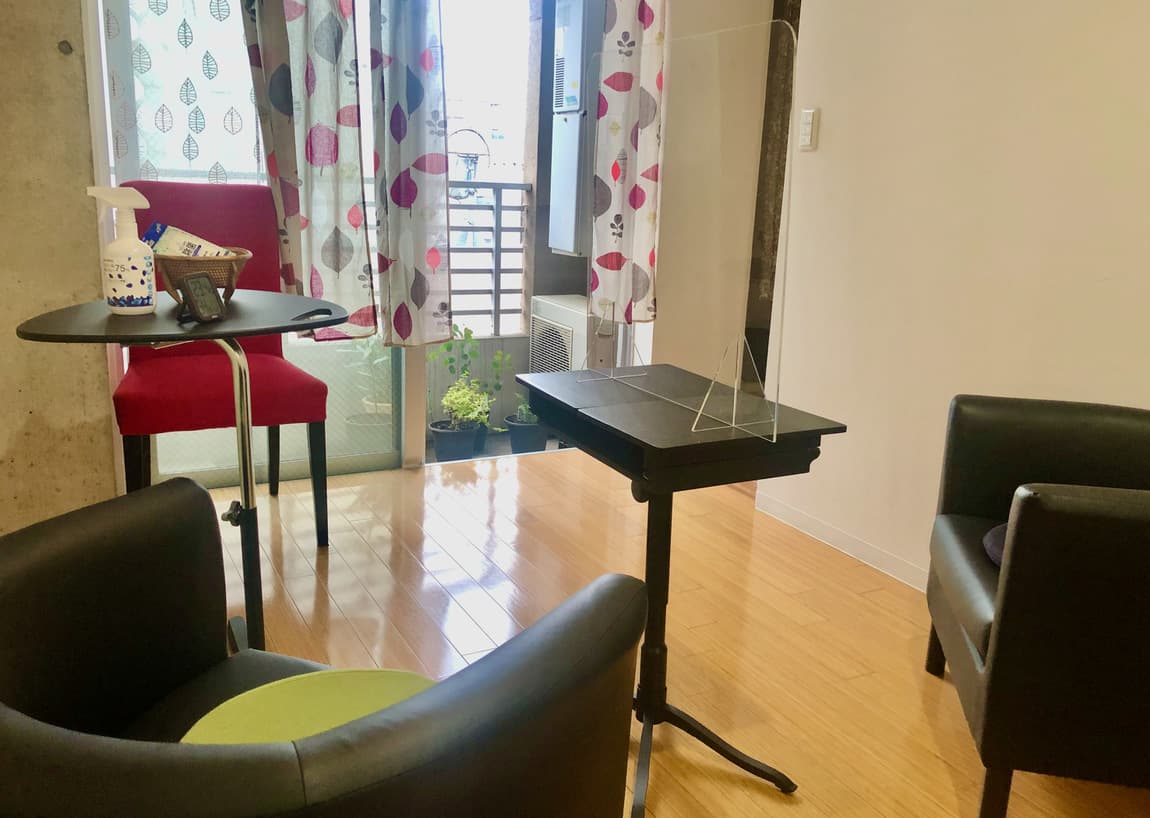 12畳ほどの広さの部屋を、お客様と講師の二人で使用します。 十分なソーシャルディスタンスをとり、ベランダの窓を開放します